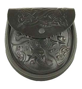 Celtic Knotwork Dog Sporran with Celtic knotwork Dog pattern on flap and front. Sporran closes with a snap button fastener. (Straps and chains are included).